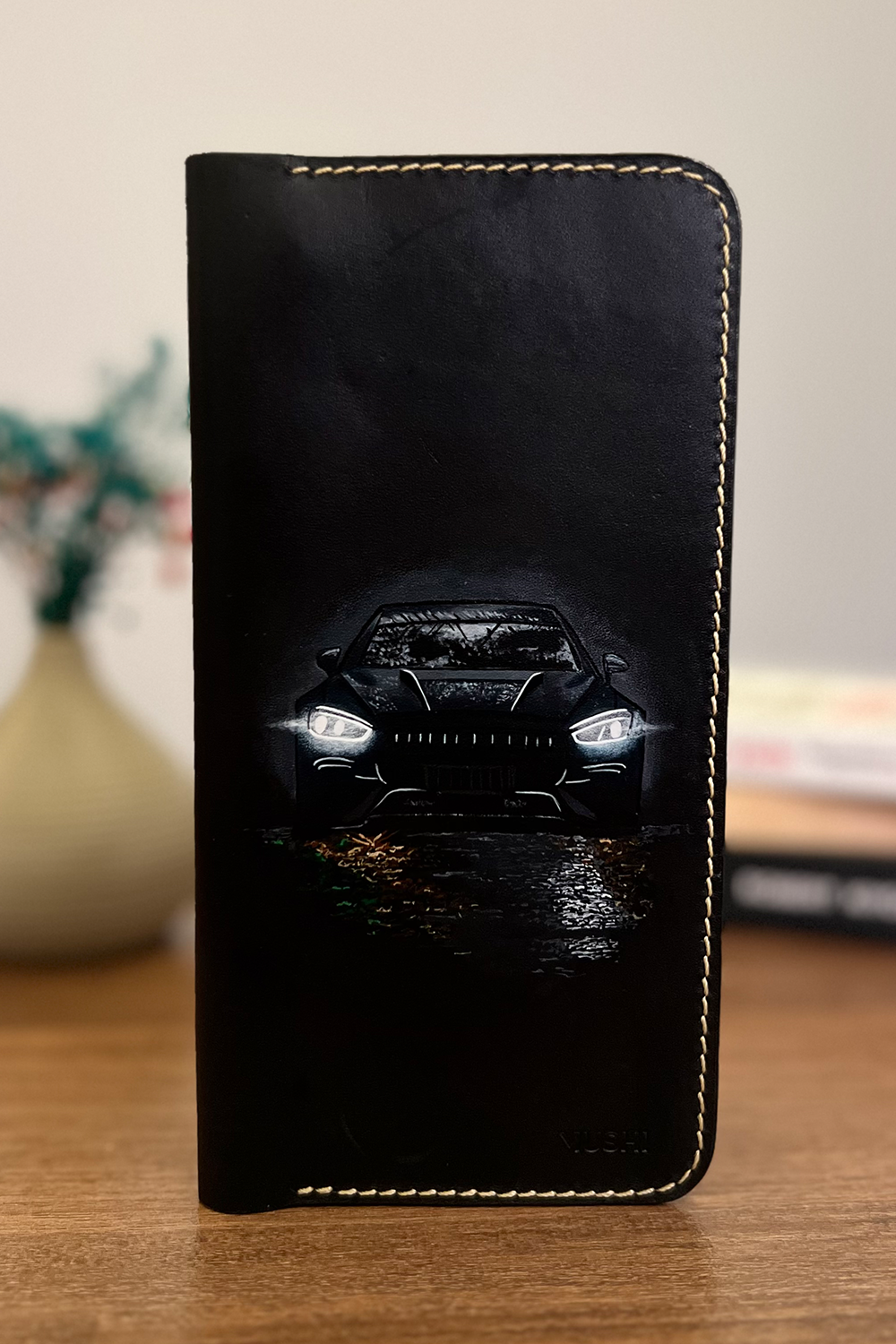 This luxury leather wallet with car art by MUSHI blends minimalist style with powerful storytelling. Created for those who value elegance, individuality, and quiet strength, it is hand-stitched with care and painted on genuine vegetable-tanned leather. As a result, the wallet feels timeless and bold.